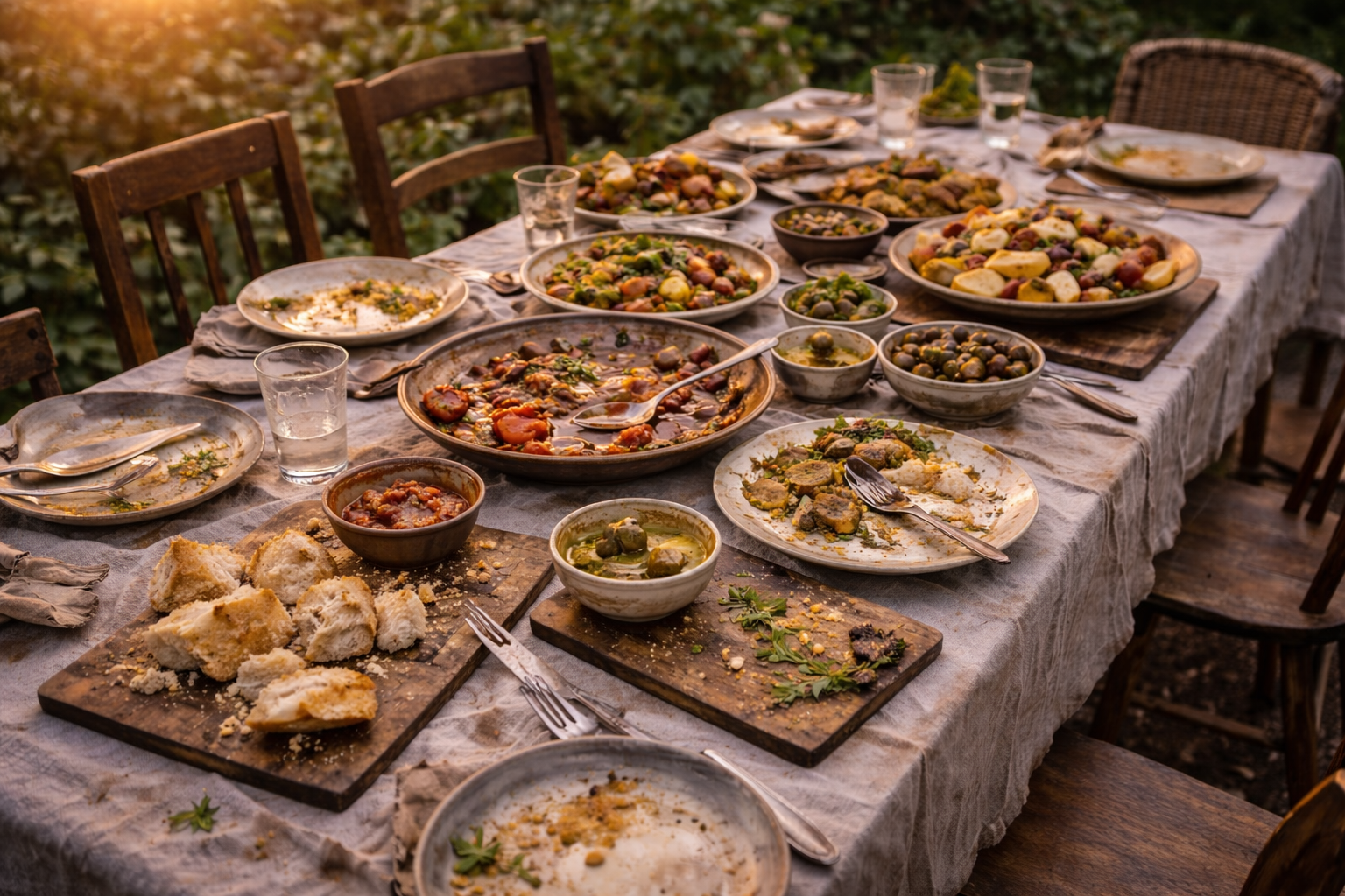 Think long tables. Shared platters. Mismatched bowls. A tomato salad piled high and unapologetic. Bread torn, not sliced. Plates stacked a little too high. Food layered for height and generosity.